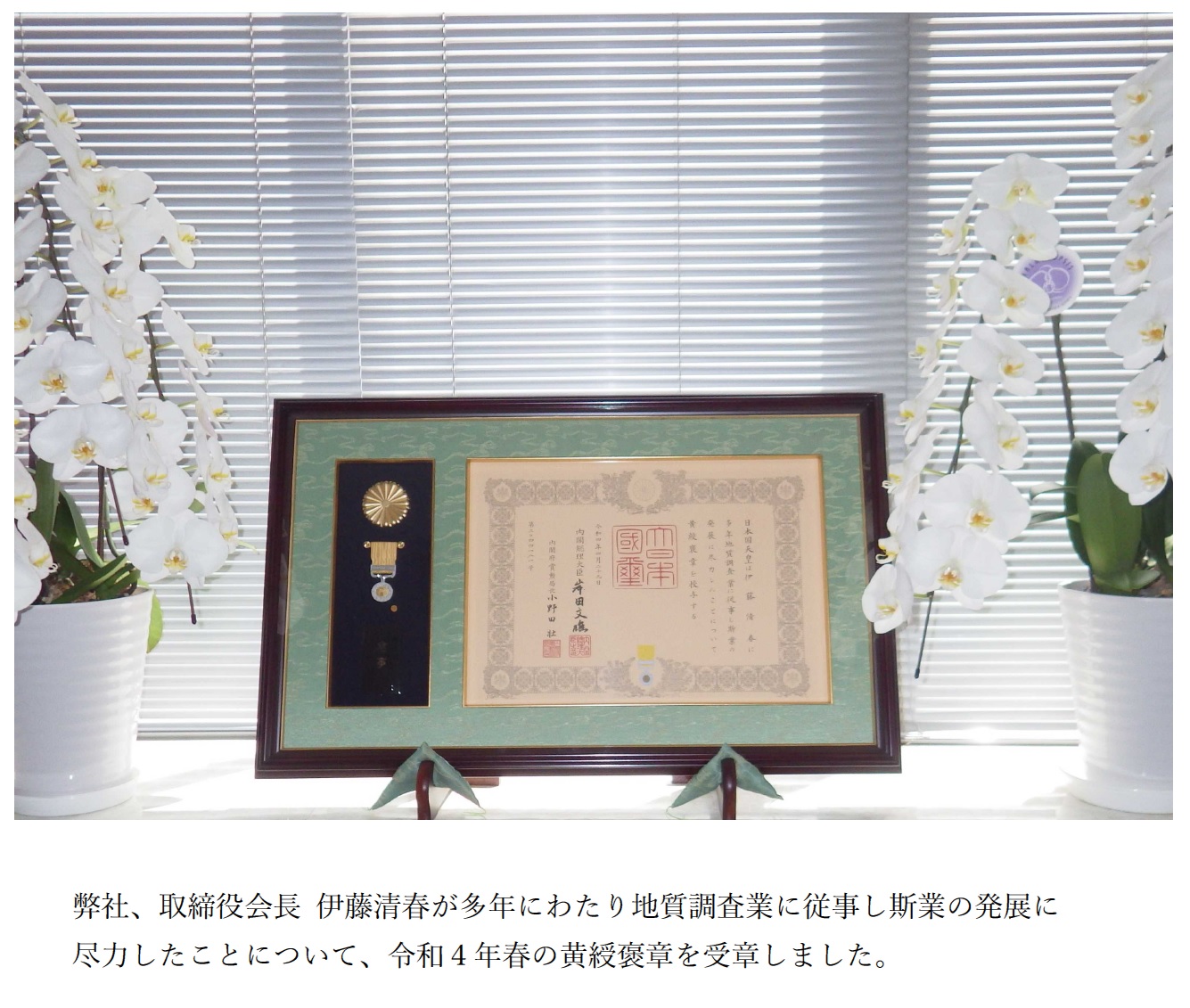 - [2022/06/08(水)] 弊社、取締役会長 伊藤清春が令和4年春の黄綬褒章を受章致しました。