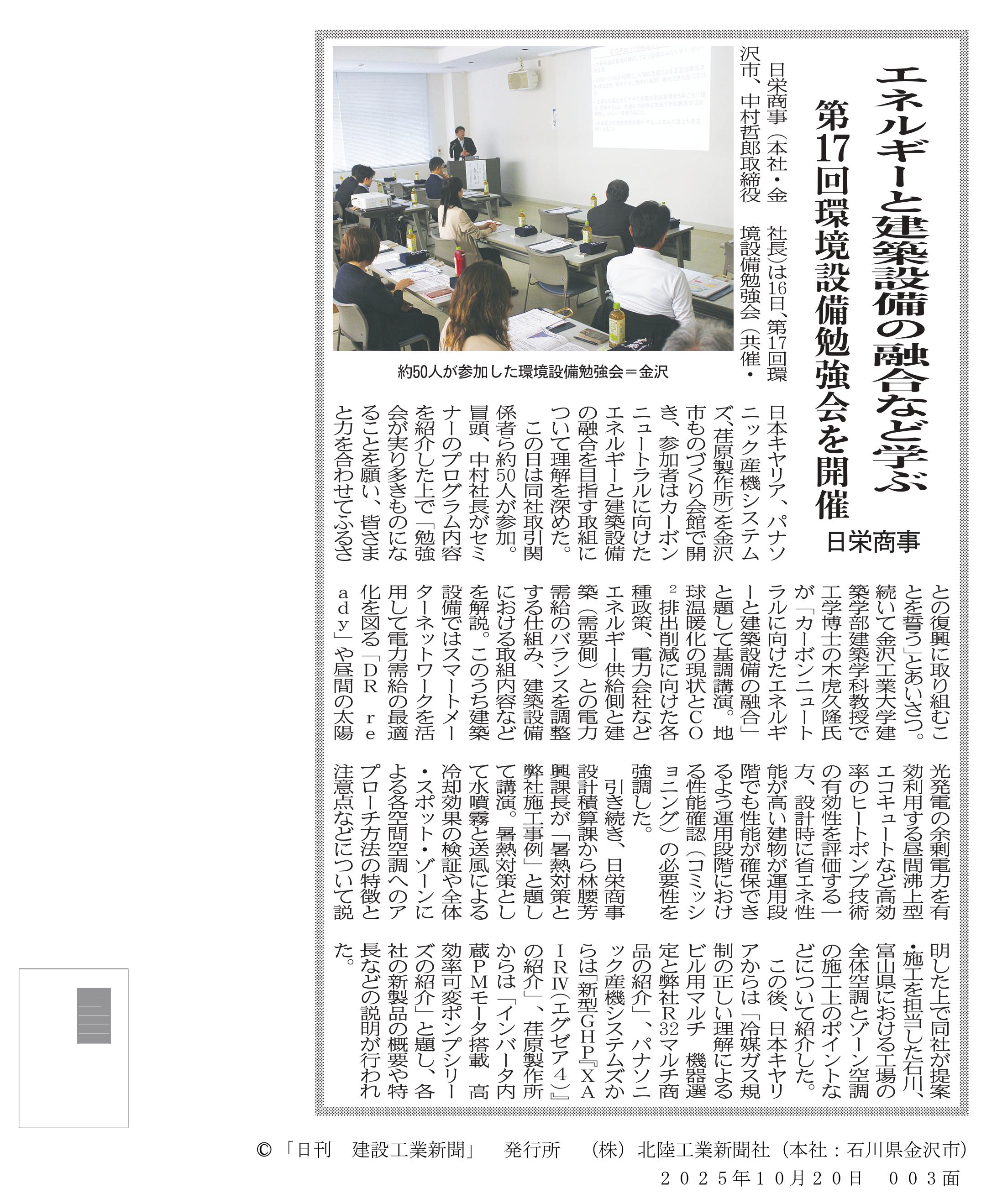 - [2025/10/16(木)] 令和7年10月16日(木) 金沢ものづくり会館にて第17回環境設備勉強会が開催されました。